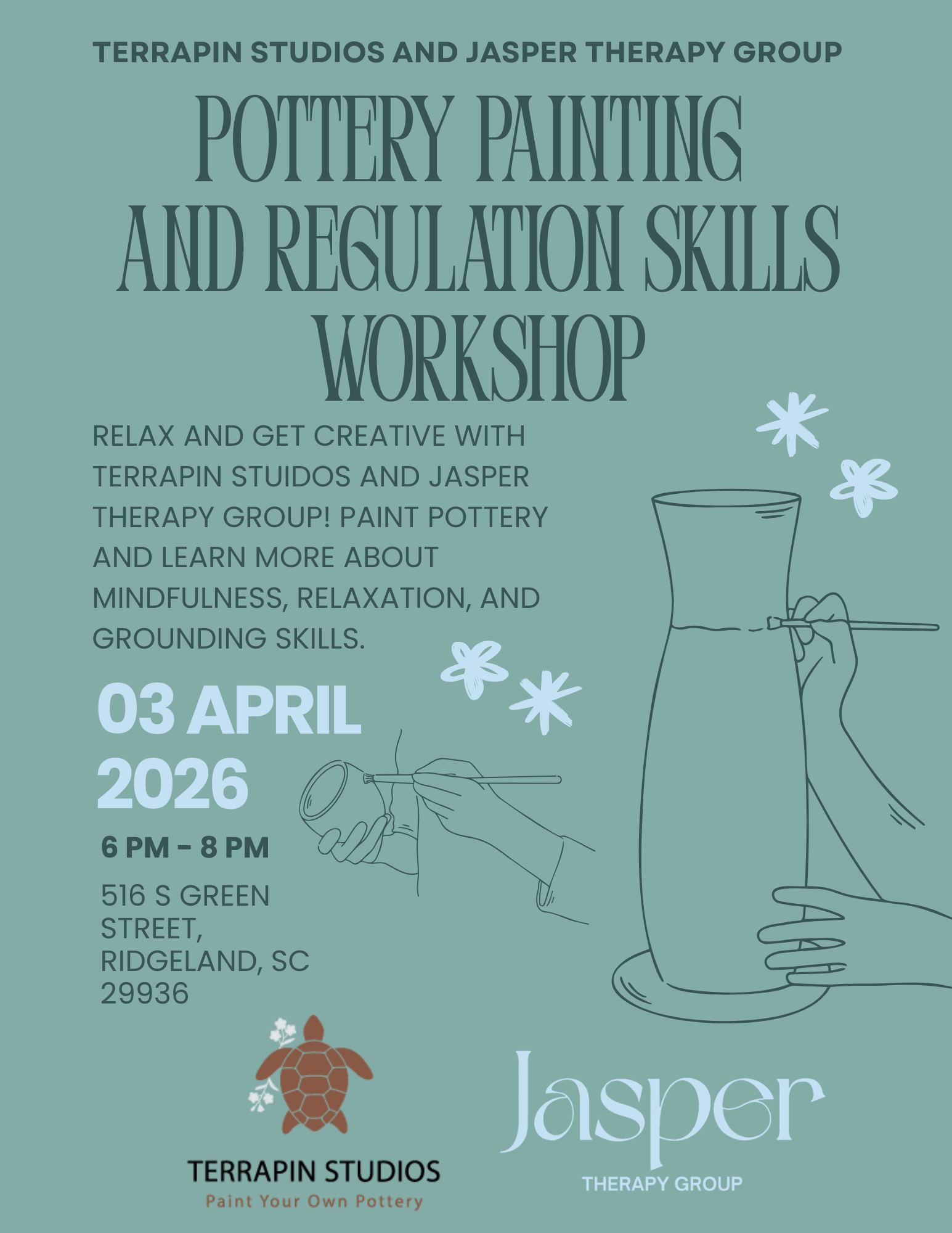 Do you like painting? Want a cute custom piece to give as a gift or add to your collection? Need help calming down or remaining calm when things get overwhelming? If you answered yes to any of these questions, you would love our pottery painting and regulation skills workshop happening in just 2 weeks at Terrapin Studios - Paint Your Own Pottery! We can't wait to see you there!